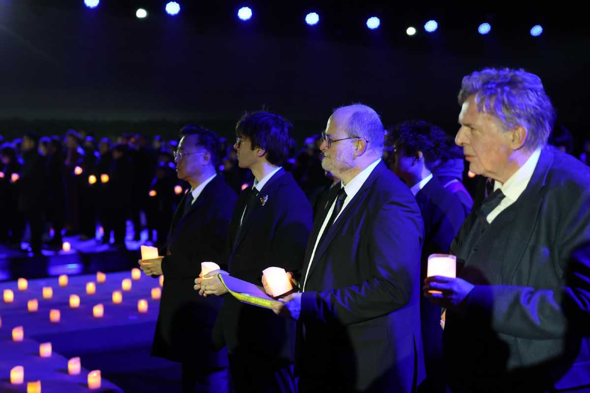People from all walks of life gather at the Memorial Hall of the Victims in Nanjing Massacre by Japanese Invaders at the night of Dec 13, 2025 to hold a "Candlelight Memorial" for the victims of the Nanjing Massacre, expressing their grief and praying for peace. [Photo by Wang Zhuangfei/chinadaily.com.cn]