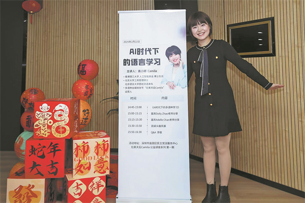 Yuan Xiaoting delivers a lecture on language learning in Shenzhen, Guangdong province, on Feb 22.[Photo provided to China Daily]