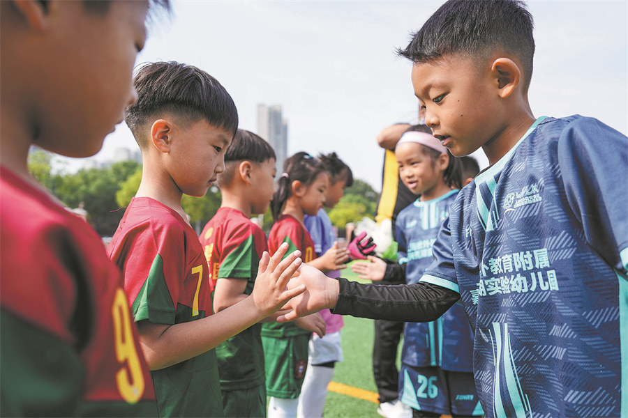 Young players greet each other before the start of a match in the kindergarten. [Photo by Sheng Jiachun/For China Daily]