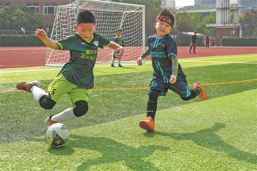Young players chase the ball in the field. [Photo by Sheng Jiachun/For China Daily]