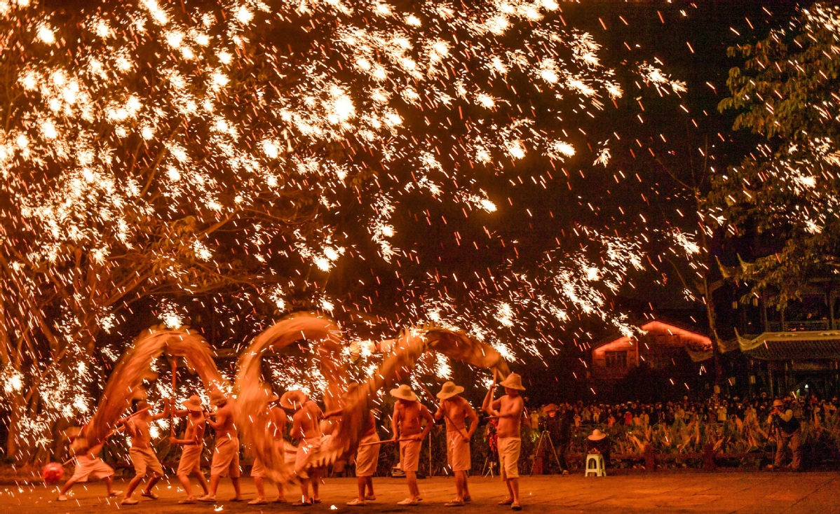 Tourists watch a folk fire dragon dance show in Huanglongxi old town in Shuangliu district, Chengdu, Southwest China's Sichuan province, on Jan 1, 2026. [Photo by Li Xiangyu/for chinadaily.com.cn]