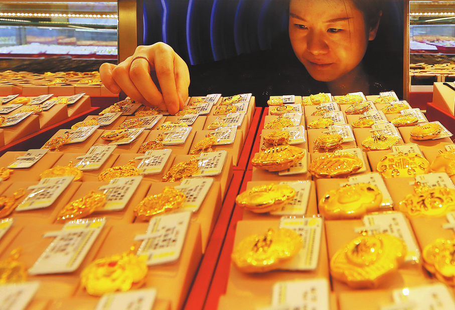 An employee sorts gold ornaments at a jewelry shop in Lianyungang, Jiangsu province. WANG CHUN/FOR CHINA DAILY