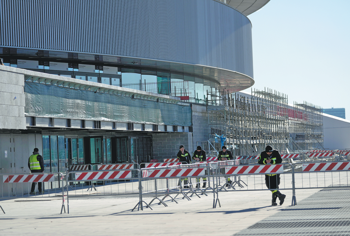 The ice rink is in place and most of the seating, but there is still an abundance of plastic sheeting, while some areas such as the locker rooms are far from finished.