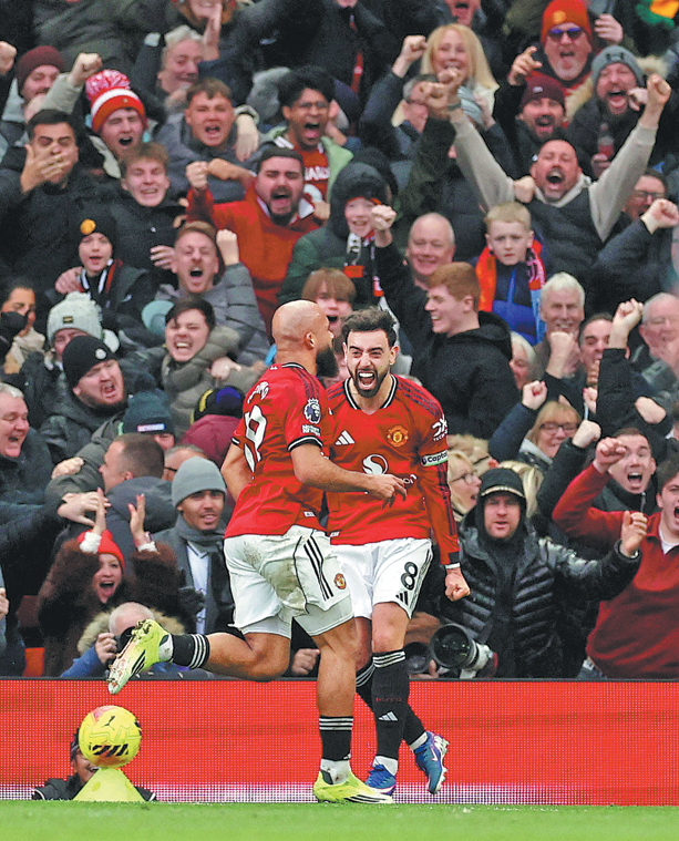 Bryan Mbeumo celebrates scoring Manchester United's first goal with Bruno Fernandes during a 2-0 English Premier League win against Manchester City at Old Trafford, Manchester, England, on Saturday. REUTERS