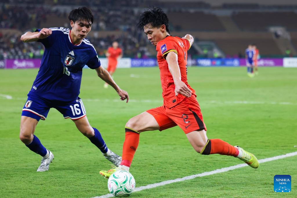 Hu Hetao (R) of China vies with Koizumi Kaito of Japan during the 2026 AFC U23 Asian Cup final match between China and Japan in Jeddah, Saudi Arabia, Jan 24, 2026. [Photo/Xinhua]