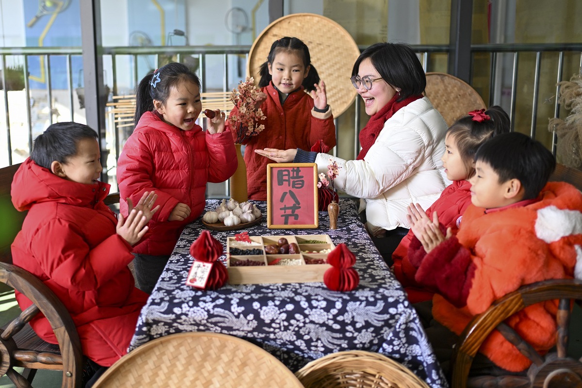 A teacher introduces ingredients of making Laba porridge at a kindergarten in Kunshan, East China's Jiangsu province, Jan 23, 2026. [Photo/Xinhua]