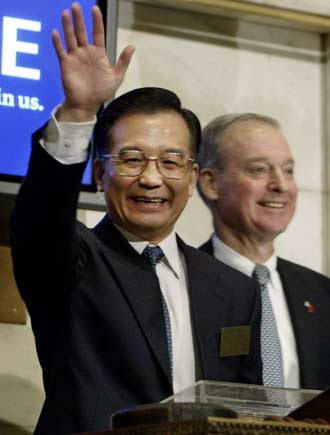 Wen Jiabao (C) waves to reporters as he tours the trading floor at