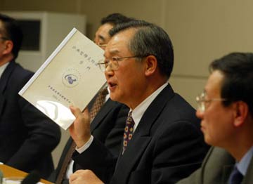 Zhang Wenkang (C), the nation's Health Minister, speaks at a press conference held April 3 in Beijing. He stressed that the Severe Acute Respiratory Syndrome, or SARS, is under control in China an