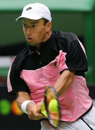 Hrbaty of Slovakia hits a backhand during his match against Davydenko of Russia at the Australian Open tennis tournament in Melbourne. [Reuters]